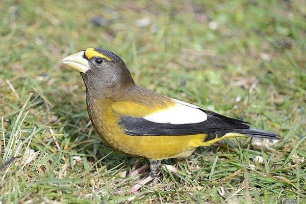 Close to 1,000 songbirds (similar to the Evening Grosbeak pictured) are dead after colliding with a single building in Chicago during the fall migration season. Photo by Vickie J Anderson/Wikimedia Commons