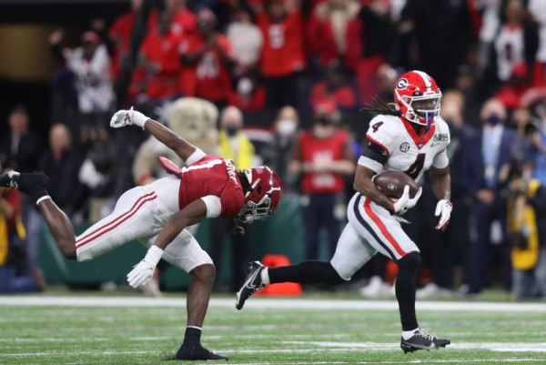 Former Alabama Crimson Tide defensive back Kool-Aid McKinstry (L) was expected to be a first-round pick in the 2024 NFL Draft, but his stock could dip because of a foot injury. File Photo by Aaron Josefczyk/UPI | License Photo