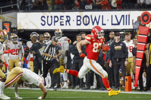 1 of 5 | Kansas City Chiefs tight end Travis Kelce (87) catches a pass against the San Francisco 49ers during the fourth quarter of Super Bowl LVIII on Sunday at Allegiant Stadium in Las Vegas. Photo by John Angelillo/UPI | License Photo