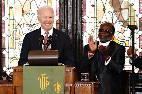 1 of 3 | President Joe Biden smiles as he is applauded by Bishop Samuel L. Green Sr. during his address at the Mother Emanuel AME Church in Charleston, S.C., on January 8. Biden is one of three candidates who will appear on the ballot for the South Carolina Democratic presidential primary on Saturday. Photo by Richard Ellis/UPI | License Photo