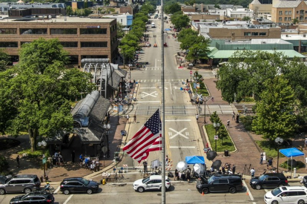 1 of 2 | An aerial photo shows an American flag at half-staff as law enforcement officers investigated the scene of a mass shooting in Highland Park, Ill., on July 5, 2022. Robert Crimo Jr., the father of the alleged gunmen, pleaded guilty to seven misdemeanor counts on Monday. File Photo by Tannen Maury/EPA-EFE