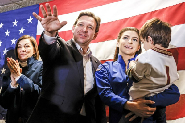 1 of 2 | Florida Governor and Republican presidential candidate Ron DeSantis stands with his wife Casey, son Mason, and Iowa Governor Kim Reynolds (L) before speaking to supporters in West Des Moines, Iowa in January. Photo by Tannen Maury/UPI | License Photo