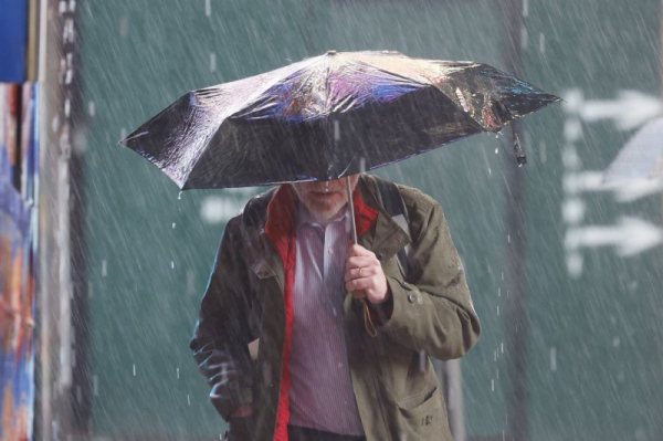 1 of 5 | A man carries an umbrella as he walks through heavy rain in Times Square in New York City on Monday. Heavy rain and gusty winds battered New York City overnight, leaving thousands of residents without power. Photo by John Angelillo/UPI | License Photo