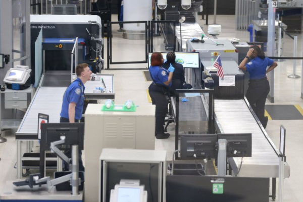 TSA agents talk among themselves as they wait for passengers at St. Louis-Lambert International Airport in St. Louis on Saturday, March 28, 2020. Assistant federal security director Maxine McManaman was arrested on charges of forgery. File Photo by Bill Greenblatt/UPI | License Photo