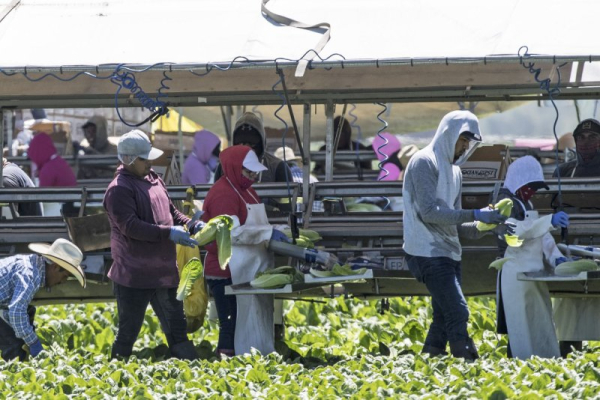 Farm workers harvest romaine lettuce in Salinas, California on Tuesday, April 28, 2020. Photo by Terry Schmitt/UPI | License Photo