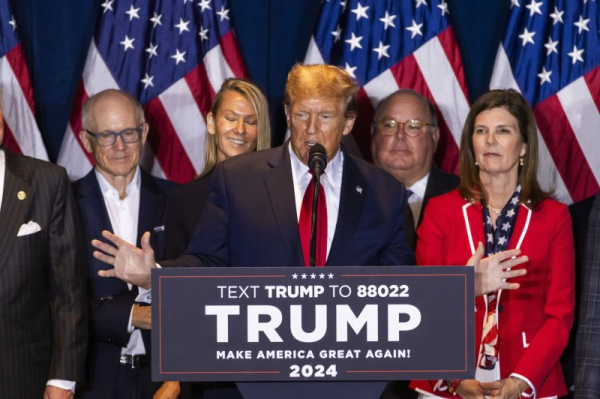 Former President Donald Trump (C) speaks after defeating former governor Nikki Haley in South Carolina’s Republican presidential primary in South Carolina Tuesday. Photo by Jim Lo Scalzo/EPA-EFE