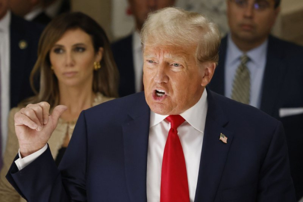 1 of 3 | Former President Donald Trump speaks out during a break from court proceedings Wednesday in New York. He was not in court on Thursday as the first defendant in the case testified that the responsibility for accurate financial records fell “squarely on Trump’s shoulders.” Photo by John Angelillo/UPI | License Photo