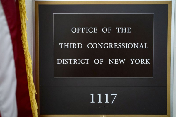An “Office Of The Third Congressional District of New York” sign is displayed outside the office of former Rep. George Santos, R-NY, after he was expelled from Congress on Friday, December 1, 2023. Santos, who was charged with 23 felonies in New York, is the six person in U.S. history to be expelled from The House of Representatives. Photo by Bonnie Cash/UPI | License Photo