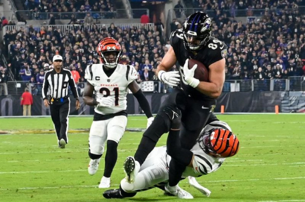 Baltimore Ravens tight end Mark Andrews (C) sustained an ankle injury from a hip-drop tackle while playing against the Cincinnati Bengals on Nov. 16 in Baltimore. File Photo by David Tulis/UPI | License Photo