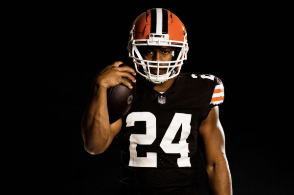 1 of 4 | Running back Nick Chubb and the Cleveland Browns will wear white facemasks in 2024. Photo courtesy of the Cleveland Browns