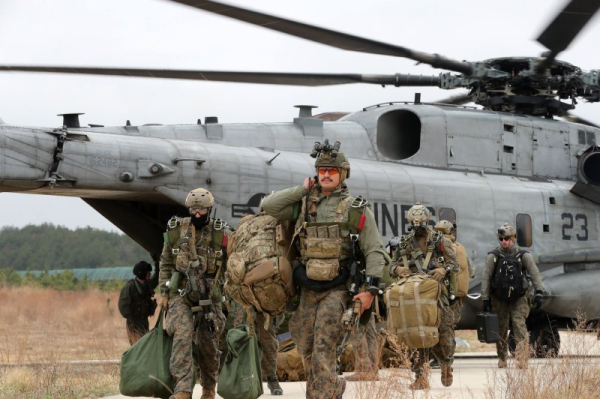 US Marines disembark the Sikorsky CH-53E Super Stallion, a heavy-lift helicopter, during combined airborne and maritime infiltration drills with South Korean and British troops in Pohang, South Korea, in March 2023. File Photo by Yonhap/EPA-EFE
