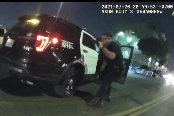 Police body camera footage from July 26, 2021, shows Los Angeles Police Department officers responding to a 911 call about a man carrying a knife. Samuel Soto was killed by police gunfire during the incident. Photo courtesy of California Department of Justice