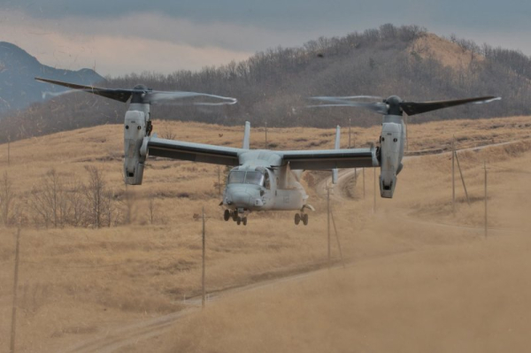 U.S. Marines’ MV-22 Osprey takes part in the joint exercise “Iron Fist 23” with Japan Ground Self-Defense Force at Hijyudai Maneuver Area in Oita-Prefecture, Japan on February 18, 2023. Photo by Keizo Mori/UPI | License Photo