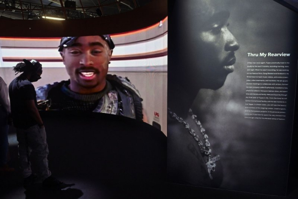 Images of Tupac Shakur are on display at The Canvas at LA Live in Los Angeles on January 23, 2022. On Friday, Las Vegas police announced the arrest of a man suspected of participating in the shooting death of Shakur. File Photo by Jim Ruymen/UPI | License Photo