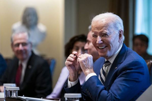 President Joe Biden smiles during a U.S.-E.U. Summit led by European Commission President Ursula von der Leyen and European Council President Charles Michel, in the Cabinet Room of the White House on Friday. Photo by Al Drago/UPI | License Photo